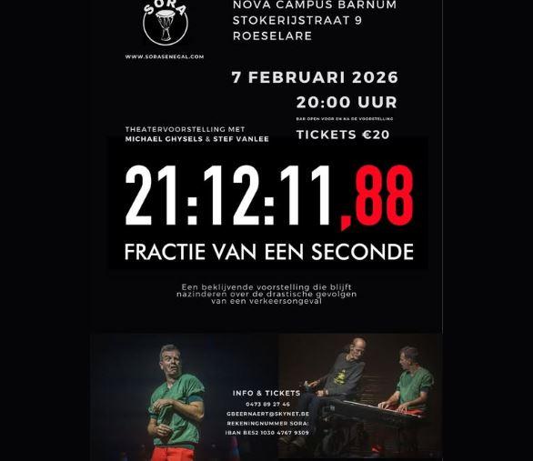 Op 7 februari vindt de theatervoorstelling fractie van een seconde plaats in school Nova campus Barnum. Deze voorstelling is een organisatie van SORA t.v.v. hun humanitair project in het dorp Daga-Youndoum Senegal. "We hebben in dit dorp al de bouw en de werking van een lokaal ziekenhuis gerealiseerd en momenteel zijn we bezig met de verdere bouw van een middelbare school zodat kinderen na het beëindigen van de lagere school extra leer- en ontwikkelingskansen krijgen. Ondertussen volgen er al een 200-tal kinderen les in deze school." Aan het woord is Gudrun Beernaert. "Sinds oktober 2023 zijn er al 3 klassen in gebruik, alsook een leraarskamer en een sanitair blok. Recent hebben we nog 1 klas extra afgewerkt en 2 klassen extra gebouwd. Er is een pergola voorzien als beschutting tegen de warme weersomstandigheden en regen. We hebben ook boompjes aangeplant op de speelplaats. Er is nog heel veel werk aan de winkel en de opbrengst van deze avond gaat integraal naar ons schoolproject in Senegal. Elk jaar gaan we op inleefreis in de paasvakantie. Sinds enkele jaren trekken steeds enkele leerkrachten en laatstejaars leerlingen van Barnum mee naar Senegal."