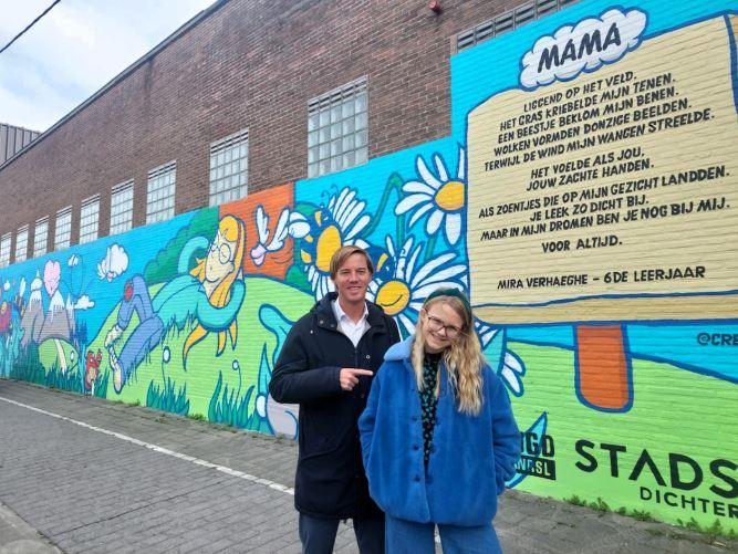 Langs de Blinde Rodenbachstraat is een nieuw muurschilderij onthuld. Het gaat om een werk van Tim Degraer van Creatude. Hij vereeuwigde het gedicht waarmee Mira Verhaeghe (12) in februari de titel van Junior Stadsdichter 2025 won. De onthulling van de mural is steevast ook het startschot voor een nieuwe editie van Junior Stadsdichter. Thema van editie 2026 is metamorfose.