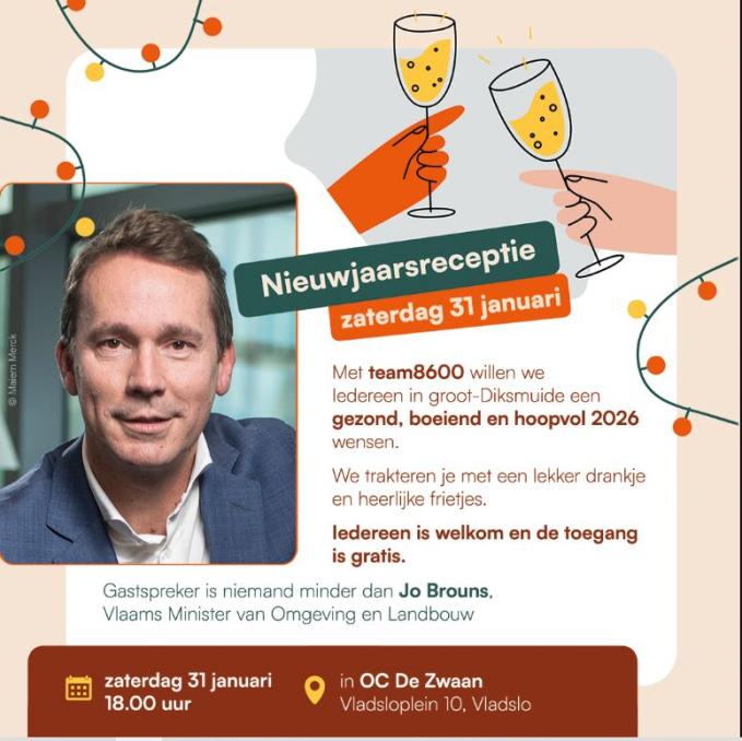 Op zaterdag 31 januari verzamelt team8600 in OC De Zwaan in Vladslo voor haar traditionele Nieuwjaarsreceptie.En dit jaar verwelkomen ze een bijzondere gastspreker; namelijk niemand minder dan Vlaams minister van Omgeving en Landbouw Jo Brouns.