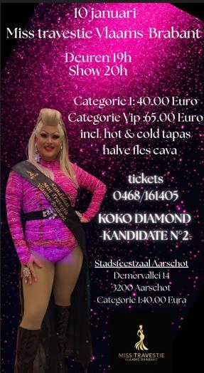 "5 tal jaar geleden, tijdens corona is Koko Diamond ontstaan, door Sparkling Majesty en ons toenmalig lid Lexi Storm. Toen deden we live sessies op Facebook en daarna begonnen de optredens. Volgens vele collega’s ben ik op 5 jaar enorm ontploft, en dat is een mooi compliment. Ik blijf steeds mezelf en you love that or hate that. Ik heb een spraakmakend badpak defile gelopen op Miss travestie België en werd Miss travestie West-Vlaanderen 2024. Een titel die ik met trots droeg en nog steeds. Ik hoop dat de nieuwe ladingen missen ook met hun voetjes op de grond blijven staan, want niet iedereen is gemaakt voor een kroon waardig te dragen en beginnen snel te zweven. En onthoud, na uw miss jaar moet je ook nog kunnen samenwerken met anderen."