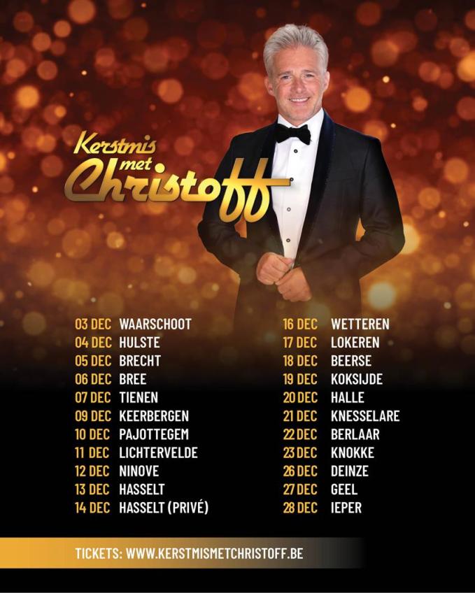 De concerten ‘Kerstmis met Christoff’ vinden plaats tussen 3 en 28 december 2026. De exacte locaties zijn vanaf nu te vinden op www.kerstmismetchristoff.be , tickets zijn op diezelfde website verkrijgbaar vanaf woensdag 22 april om 9u.