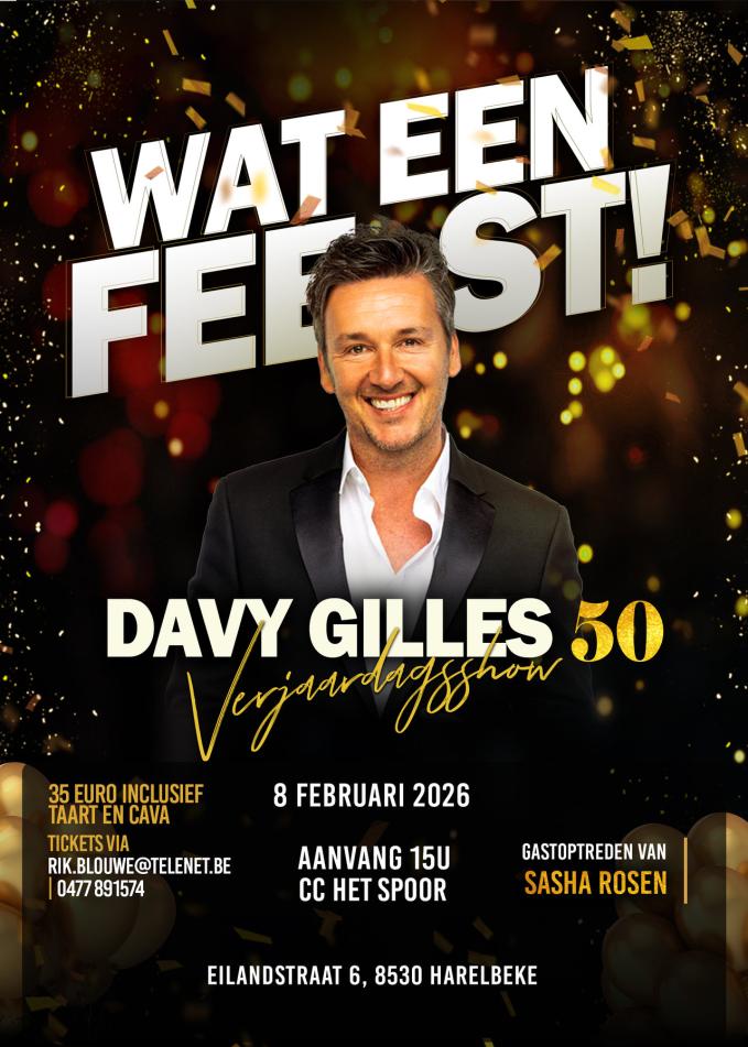 Op 10 februari wordt Davy Gilles 50 jaar en dat moet gevierd worden! Op 8 februari zal hij dan ook een geweldige verjaardagsshow geven in CC Het Spoor in Harelbeke. Sasha zal als gastartiest ook op het podium staan, maar het draait die dag natuurlijk vooral om Davy zelf. Tickets kosten € 35,- p.p. en dat is inclusief een glaasje cava én een stuk taart.