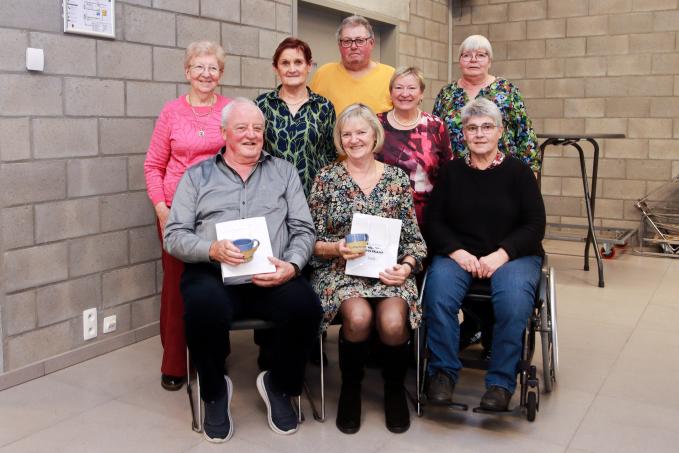Op de foto de kampioene Martine D'Hooghe en vice-kampioen Daniel Devoldere, samen met het bestuur van Okra De Tassche.