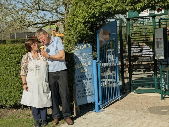 16 uur: ijsjestijd! Wie het Brugse Ommeland zegt, denkt dan onwillekeurig aan de IJshoeve in het naburige Vivenkapelle. Carine en Patrick hebben er in 28 jaar een echt paradijsje voor jong en oud van gemaakt. Met een eigen parking, een mooie speeltuin, een prachtig terras en (vooral) een waaier aan verrukkelijke ijsjes in alle smaken en kleuren, gemaakt van dagverse melk van de eigen koeien op de boerderij. Als een Rupsje Nooitgenoeg bestel ik drie bollen en voel niets dan dankbaarheid voor zoveel lekkers. Dat de IJshoeve een paar jaar geleden tot winnaar van de Award voor de betere Kind/Fietsvriendelijke horecazaak geridderd werd, is zeker niet toevallig. Ik heb geproefd, dus ik geloof….