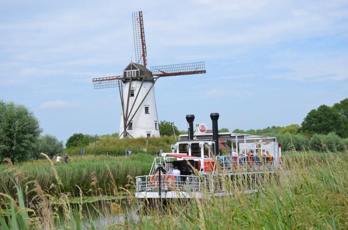 In pakweg zestig jaar is er weinig veranderd in Damme. Er is nog steeds de boekenmarkt, de vaste nestplaats van de ooievaars op het stadhuis en het klokje dat steeds wat trager tikt. Ver weg zijn de therapeuten, geestverruimende paddenstoelen, Burger Kings en lange files. De inwoners drinken ’s morgens nog een tas verse melk en de zorgen van het leven worden ’s avonds doorgespoeld met een Damse gin. Qua slow motion of happiness maken we deze namiddag een tochtje met de nostalgische Lamme Goedzak. Aardig wat volk op deze populaire rivierboot die zo’n viermaal per dag heen en weer vaart tussen Damme en Brugge. De Lamme Goedzak baadt terug in zijn authentieke stijl van weleer en biedt elke bezoeker die aan boord stapt, een unieke en nostalgische ervaring langs het meest schilderachtige panorama van het Brugse Ommeland. De slome boot laat ons gedurende 2 x 35 minuten genieten van het voorbijglijdend polderlandschap omzoomd met statige populierenrijen. Zeker te noteren….