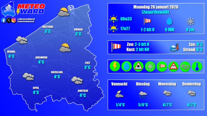 Vandaag verloopt zwaarbewolkt tot betrokken maar overwegend droog. De wind waait zwak uit noordoost tot oost. Het wordt max. 3-4°C.