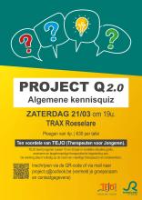 Op zaterdag 21 maart organiseren we samen met enkele collega's bij de stad Roeselare de tweede editie van de project Q quiz. De opbrengst gaat dit jaar integraal naar Tejo. De organisatie Tejo biedt jongeren tussen de 10 en 20 jaar in moeilijke situaties, gratis anonieme, laagdrempelige therapeutische begeleiding aan. De werking steunt volledig op de inzet van vrijwillige therapeuten en vrijwilligers.