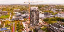 De grootste studententoren van Kortrijk heeft haar finale hoogte bereikt. Om dit te vieren, hebben arbeiders vanmiddag met een bouwkraan traditiegetrouw een meiboom geplaatst op 53 meter hoogte - dit keer een uit de kluiten gewassen exemplaar dat er permanent zal blijven staan. “Daarmee is de ruwbouwfase voltooid en kan de afwerking starten”, luidt het. “De eerste studenten zullen bij de start van het volgende academiejaar hun intrek kunnen nemen in ‘The Sky’.”