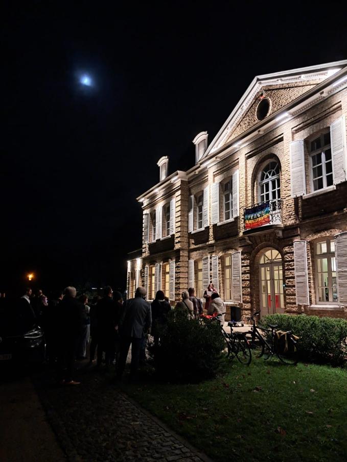 Burgemeester Koen Coupillie opende de avond door zijn bewondering uit te drukken voor alle inzet, maar ook met een duidelijke appreciatie vanwege alle leerkrachten Nederlands (zoals hijzelf). Daarna werd het publiek gewoonweg aan de deur gezet, maar dan wel om de eerste voorleessessie aan de prachtig verlichte voorgevel te starten. De aanwezigen werden er zowaar muisstil van. Het nieuwe boek “de Grimoire van een Magiër” speelt zich namelijk af in een landhuis dat verdacht veel lijkt op het Esenkasteel. Zo kon iedereen zich volledig inleven in het voorgelezen fragment.