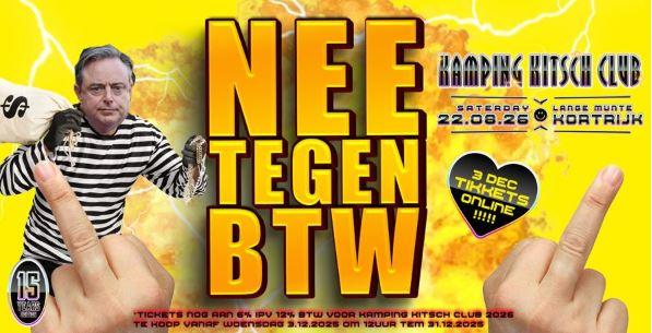 Op zaterdag 22 augustus 2026 kan je op de Lange Munte in Kortrijk terecht voor de 15de editie van Kamping Kitsch Club, ‘het grootste verkleedfeestje ter wereld’. Traditioneel start de ticketverkoop op Valentijn, maar door de onsympathieke begrotingsmaatregelen van de regering wordt die vervroegd naar komende woensdag 3 december. “Vanaf 12 uur kan je ‘pre-btw-tickets’ kopen, want als eerste festival geven wij een krachtig signaal en zeggen we luid en duidelijk ‘NEE’ tegen de btw-verhoging op eventtickets. Vanaf 1 januari 2026 gaat die van 6 naar 12 %. Dat is een stevige stijging die de overheid doorvoert en eentje die vooral de ticketkopers in hun zakken gaan voelen. Omdat we allemaal weten hoe kostelijk het leven is, schakelen we nu sneller in onze ticketverkoop en bieden we nog tot 31 december 2025 middernacht kaartjes voor het 15deverjaardagsfeestje van Kamping Kitsch Club aan tegen 6% btw”, klinkt het bij de organisatie.