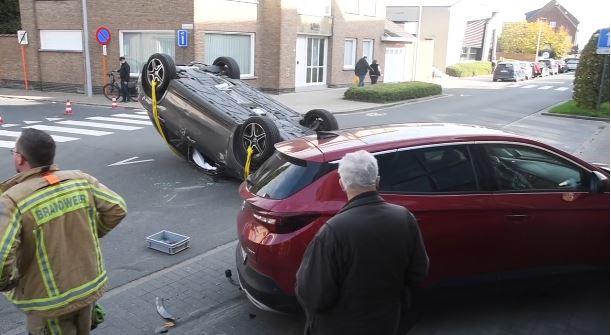 Een 89-jarige man uit Poperinge is zondag in het centrum van de stad tegen de geparkeerde auto van een brandweerman gebotst. Daardoor kwam de Mercedes van de bejaarde man op z’n dak terecht. De bestuurder kwam er met de schrik vanaf. Beide voertuigen liepen zware schade op.