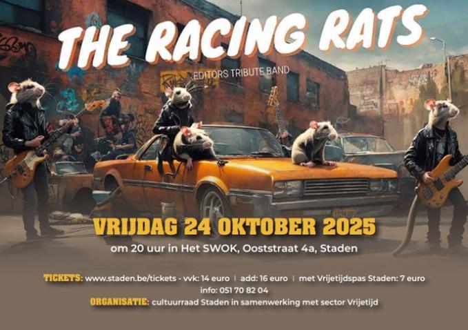 De cultuurraad en de gemeente Staden organiseert op vrijdag 24 oktober om 20h in het SWOK te Staden een optreden van de tributeband van “the Editors”: “the Racing rats”. Tickets via www.staden.be/tickets In voorverkoop betaal je 14 Euro, aan de deur 16 Euro en met een vrijetijdspas van de gemeente Staden betaal je 7 Euro.
