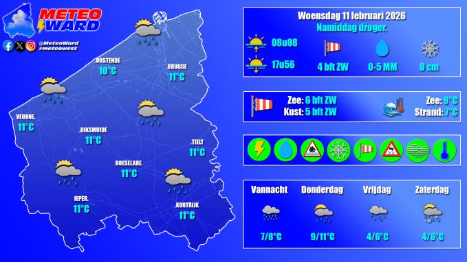 Vandaag is het opnieuw zacht met maxima rond 10-11°C. Er zijn in de loop van de dag enkele opklaringen mogelijk maar de nadruk ligt op de bewolking met vooral in de eerste helft van de dag wat regen of enkele buien. Na de middag zou het droger moeten zijn. De wind waait matig en aan zee vrij krachtig uit het zuidwesten.