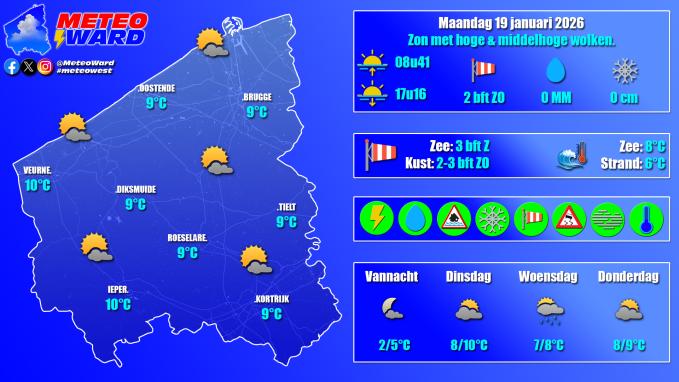 Vandaag krijgt de zon gezelschap van hoge en middelhoge bewolking maar het blijft droog. De wind waait zwak tot vrij matig uit het zuidoosten bij maxima tot 9-10°C.