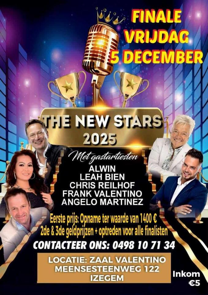 Onlangs was er de halve finale van 'The New All Stars', een muziekwedstrijd in zaal Valentino in Izegem. Zanger Chris Reilhof mocht heelwat West-Vlaams zangtalent verwelkomen in een overvolle zaal. De finale gaat door op vrijdag 5 december met gastoptredens van Alwin, Leah Bien, Frank Valentino en Angelo Martinez. De winnaar krijgt een opname ter waarde van 1400 Euro. De tweede en derde krijgt een geldprijs, maar alle finalisten zullen geregeld uitgenodigd worden voor een optreden in zaal Valentino.