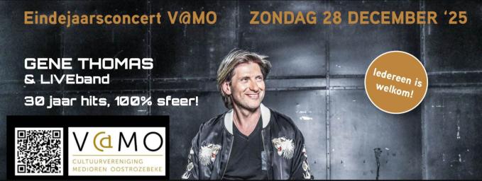 Op 28 december '25 organiseert V@MO Oostrozebeke hun 7e groot Concert in de Ginstekerk (Grotstraat 1) te Oostrozebeke. Gene Thomas geeft er om 15u een prachtig live eindejaarsconcert met muzikanten! Gereserveerde kaarten kan je boeken met een QR Code of de link op Facebook via VAMO! Boek nu nog vlug je tickets! Voor info of hulp voor boekingen bel 0477 767700.