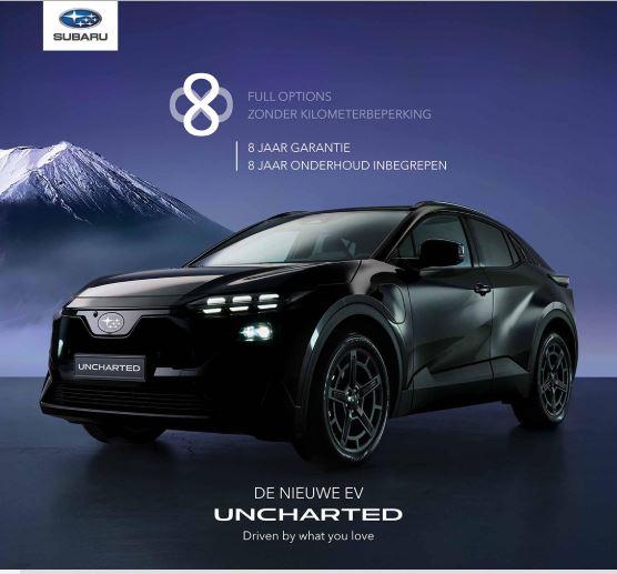 De horizon roept. De UNCHARTED verkent nieuwe wegen. Deze volledig elektrische SUV belichaamt sportiviteit, vrijheid en duurzaamheid. Verkrijgbaar met voorwielaandrijving of het unieke AWD-systeem van Subaru, biedt hij elke rit veiligheid en comfort, terwijl je bijdraagt aan een toekomst zonder uitstoot. Met de Uncharted krijgt fun to drive een volledig nieuwe dimensie.