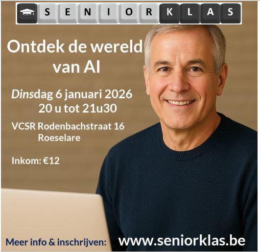 "Tijdens mijn vrijwilligerswerk als Digihelper in Arhus, gebruik ik meer en meer AI om te helpen bij het maken van stappenplannen. Zo ben ik in de wereld van kunstmatige of Artificiële Intelligentie gedoken. Ik merk veel interesse voor AI bij de mensen. Daarom geef ik op dinsdag 6 januari 2026 van 20u tot 21u30 een voordracht met als onderwerp: Wat kan AI voor jou betekenen? Ik verduidelijk in mensentaal wat AI is en hoe het werkt. Ik bespreek de voordelen, maar ga ook de nadelen niet uit de weg. Met praktische voorbeelden toon ik hoe iedereen AI kan gebruiken in zijn dagelijks leven. Er is natuurlijk ook plaats voor vragen en discussie."