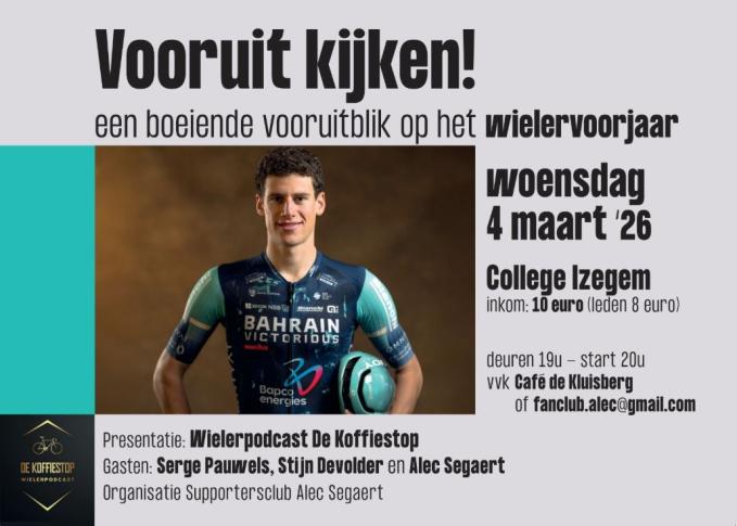 Op woensdag 4 maart organiseren ze met de supportersclub van Alec Segaert de 3e editie van Vooruit kijken!, een boeiende voorbeschouwing op het wielervoorjaar. "Met Serge Pauwels en Stijn Devolder hebben we dit jaar opnieuw twee interessante gasten die elk een eigen link hebben met Alec. Serge is niet alleen huidige bondscoach maar werkte al samen met Alec van bij de nieuwelingen en zat ook in de auto toen Alec zijn eerste Europese titel tijdrijden behaalde. Stijn die alom gekend is door zijn indrukwekkend palmares, was als jeugdrenner lid van de Kortrijkse Groeningespurters (café De Kluisberg die nu het supporterslokaal is van Alec) en heeft Alec mee begeleid op weg naar zijn eerste Paris-Roubaix bij de junioren, waar hij meteen tweede werd."
