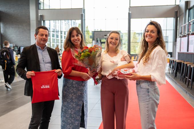 De 20.000e student werd vandaag extra in de bloemetjes gezet. Hélène Verstraete (28) uit Ruislede, reageert enthousiast: “Enkele jaren geleden was ik gestart aan de bachelor in de agro- en biotechnologie, afstudeerrichting dierenzorg maar toen koos ik ervoor om te gaan samenwonen en te beginnen werken. Mijn studies heb ik dan een tijd on hold gezet. Omdat ik toch graag mijn passie wil volgen in mijn job en daarvoor het diploma dierenzorg nodig heb, kies ik vandaag opnieuw voor Hogeschool VIVES om mijn bachelor af te werken. Ik zal dit doen in afstandsonderwijs omdat ik net mama geworden ben van Léonie en zo mijn studies flexibel kan combineren met mijn werk én mijn jonge gezin. Dat maakt het voor mij haalbaar én motiverend.”