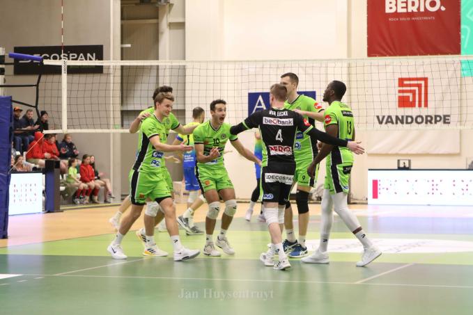 Volleybal Team Decospan Menen blijft ook na de topper bij Lindemans Aalst ongeslagen, maar het moest daarvoor wel een 2-0 achterstand goedmaken. In set drie en vier won Menen telkens met 20-25, de belle werd door de bezoekers gewonnen met 8-15. Knack Roeselare kende dan weer weinig problemen met rode lantaarn Caruur Gent en won in drie simpele sets. De setstanden waren 25-11, 25-18 en 25-20.