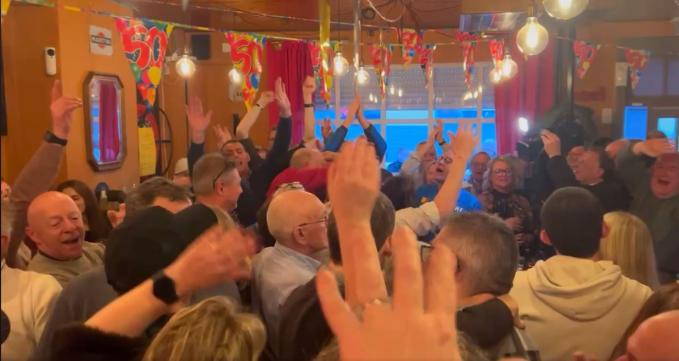 Vier stamgasten van café De Gouden Leeuw in Meulebeke zijn erin geslaagd het Belgisch record toogzitten te breken. Na maar liefst 55 uur zonder slaap mochten Bart Vanderstraeten (51), Franky Vandekerckhove (55), Steven Verbrugghe (50) en Filip Soenens (65) hun kruk verlaten. Om zeker te zijn dat alles goed verliep, kwam een dokter elke voormiddag langs voor een check-up. De laatste loodjes wegen meestal het zwaarst en dat was ook bij de heren zo. Na 52 uur was het nog even doorbijten, maar plots kregen ze bezoek van Véronique De Kock, meegebracht door bekende Meulebekenaar Wim Debouver. “Ik vind het een ongelooflijk tof initiatief”, reageert ze. “Ik vind het straf dat die mannen nog zo helder reageren na twee nachten zonder slaap. Ik zou het zelf niet kunnen, dus een dikke chapeau.” Vanzelfsprekend was er zondagavond een zot feestje in De Gouden Leeuw.