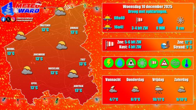 Vandaag blijft het grotendeels tot helemaal droog met opklaringen en wolkenvelden. De wind waait (vrij) matig uit het zuidwesten. Het wordt max. 13°C.