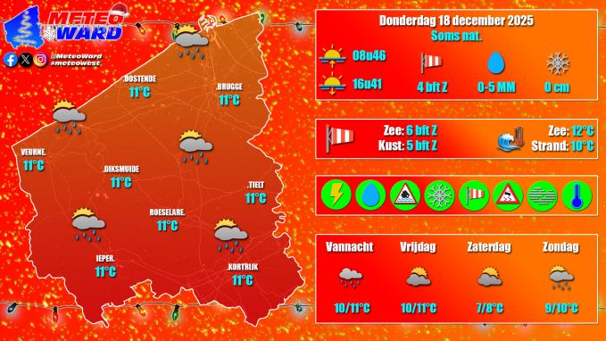 Morgen start zwaarbewolkt met nog kans op wat regen maar al snel wordt het droog en volgen er wat opklaringen. De zuidwestenwind waait vrij matig bij maxima van 10-11°C.