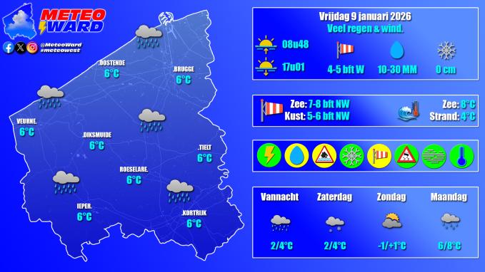 Vandaag trekt de kern van storm Goretti over onze regio. De wind ruimt naar west tot noordwest en waait matig tot vrij krachtig in de provincie en vrij krachtig tot hard aan zee met eerst rukwinden tussen 70-90 km/u in de zuidelijke provinciehelft. Later zijn er nog rukwinden tussen 50-70 km/u. Voor de rest verloopt de dag grijs en kletsnat met ook in de zuidelijke provinciehelft de meeste regen. We halen 6°C maar gaandeweg de dag wordt het een fractie kouder.