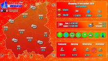 Vandaag kijken we tegen veel grijze wolken aan. Een schaarse opklaring is echter op goed geluk. De wind waait zwak tot vrij matig uit noordelijk hoek. We halen 3-6°C.