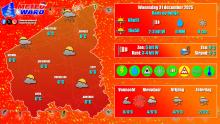 De overgang van oud naar nieuw verloopt droog bij een wisselend tot zwaarbewolkt weerbeeld. Het kan ook wat nevelig worden. De wind waait (vrij) matig uit zuidwest tot west. Het koelt af tussen 0-4°C.